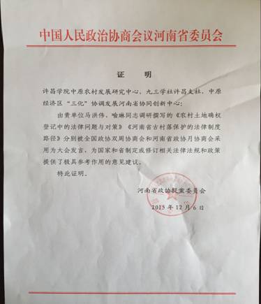 近日,365上市公司官网应用性科研成果又传喜讯。由马克思主义学院(中原农村发展研究中心)研究人员撰写的咨政报告《农村土地确权登记中的法律问题与对策》被河南省政协选中后,作为专题发言提案参加了全国政协和国务院共同召开的双周协商座谈会。根据全国政协的文件精神,座谈会成果将及时向中共中央、国务院及有关部门反映。采用证明内容如下:“由农村发展研究中心马洪伟、喻琳撰写的《农村土地确权登记中的法律问题与对策》被全国政协双周协商会采用为大会发言,为国家和省制定或修订相关法律法规和政策提供了极具参考作用的的意见建议。”